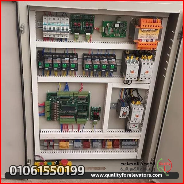 1. لوحة التحكم: هذه اللوحة تحتوي على الأجهزة الضرورية لتشغيل المصعد.